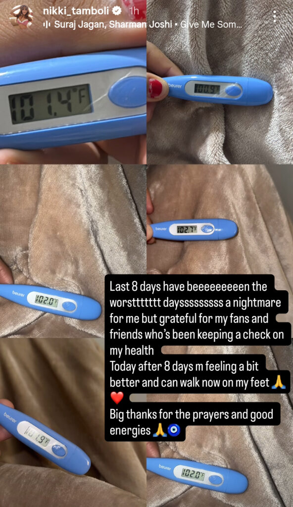 Taking to her Instagram stories, Nikki wrote, “Last 8 days have been the worst days, a nightmare for me. But I am grateful for my fans and friends who have been keeping a check on my health. Today after 8 days, I am feeling a bit better and can walk now on my feet. Big thanks for the prayers and good energies.”