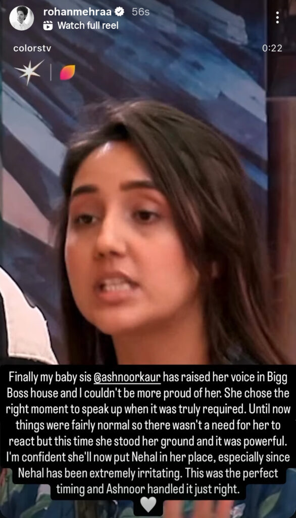 Interestingly, actor Rohan Mehra, who played Ashnoor’s brother in Yeh Rishta Kya Kehlata Hai, also came forward in her support. The two still share a sibling-like bond even after the show. Sharing the promo on his Instagram story, Rohan praised Ashnoor and wrote, “Finally my baby sis Ashnoor Kaur has raised her voice in Bigg Boss house and I couldn’t be more proud of her. She chose the right moment to speak up when it was truly required. Until now things were fairly normal, but this time she stood her ground and it was powerful. I am confident she will now put Nehal in her place, especially since Nehal has been extremely irritating. This was the perfect timing and Ashnoor handled it just right.”