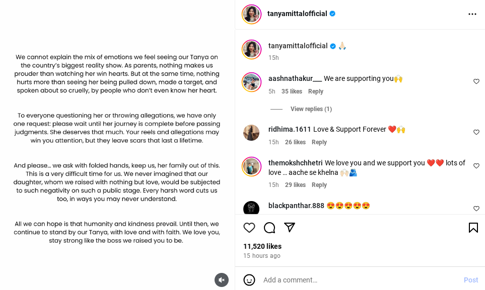 Several social media users have been making memes and negative reels on Tanya, which has deeply affected her family. Hurt by the constant trolling, Tanya’s parents shared an emotional statement through her official Instagram handle. They expressed pride in seeing their daughter on India’s biggest reality show but also shared the pain of watching her being pulled down by strangers.