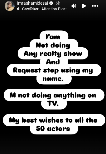 Even before the show begins, several celebrity names have been making rounds as probable contestants. One such name was Rashami Desai, which quickly grabbed attention due to her popularity and strong reality show background. However, Rashami was quick to clear the air. Taking to social media, the actress dismissed the rumours and wrote, “I’m not doing any reality show and request stop using my name. I am not doing anything on TV. My best wishes to all the 50 actors.” Her statement put an end to the ongoing speculation surrounding her participation.