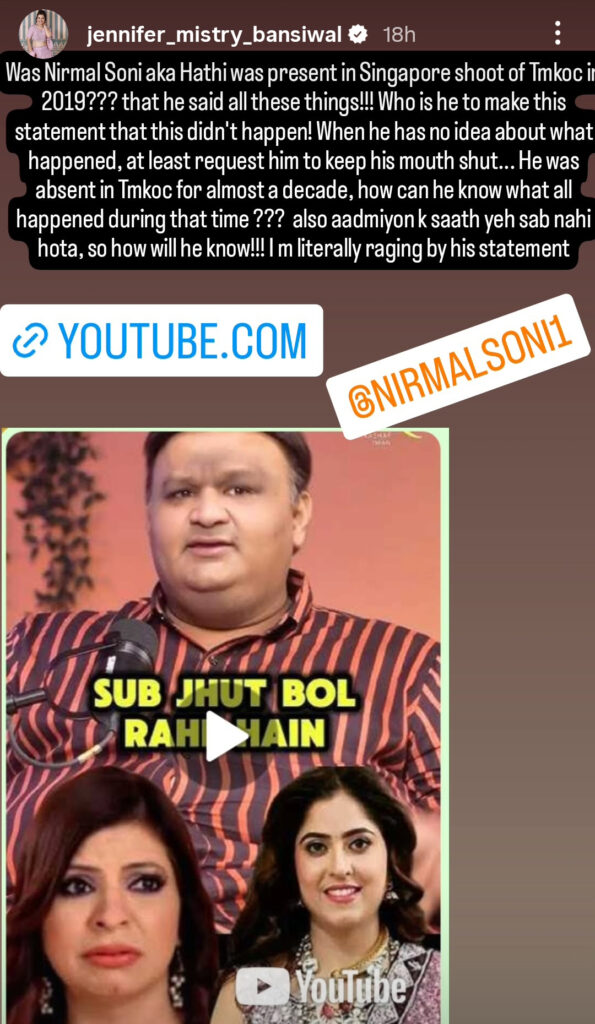 Jennifer was quick to respond and slammed Nirmal Soni on Instagram. Sharing his interview video, she wrote: “Was Nirmal Soni aka Hathi present in the Singapore shoot of TMKOC in 2019 that he said all these things? Who is he to make this statement that this didn’t happen, when he has no idea about what happened. At least request him to keep his mouth shut… He was absent in TMKOC for almost a decade, how can he know what all happened during that time?? Also aadmiyon ke saath yeh sab nahi hota (this doesn’t happen with men), so how will he know!! I am literally raging by his statement.”